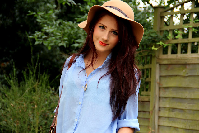 Hat: Topshop. Jeans: Topshop. Blouse: C/O The Vintage Set. Bag: Vintage. Boots: H by Hudson. Belt: Vintage Lipstick: Topshop Infrared. |