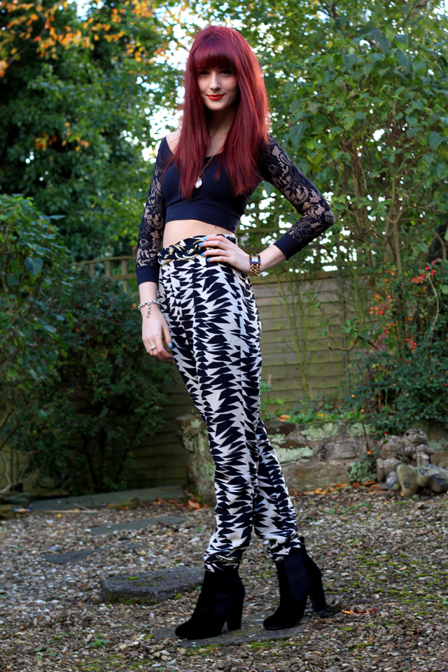 Black Crop Top: Bank Fashion*. Animal Print Trousers: Bank Fashion*. Belt: Vintage. Boots: TK Maxx. Lipstick: Topshop Infrared. |