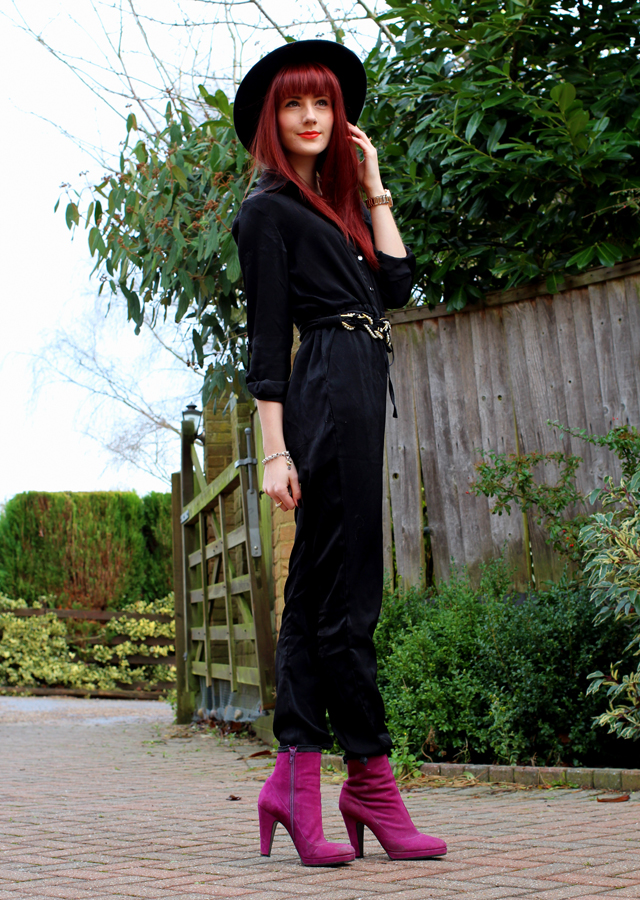 Silk Shirt Jumpsuit: Missguided*. Boots: Marc Jacobs (similar here). Belt: Vintage. Fedora: Topshop. Watch: Ernest Jones* |